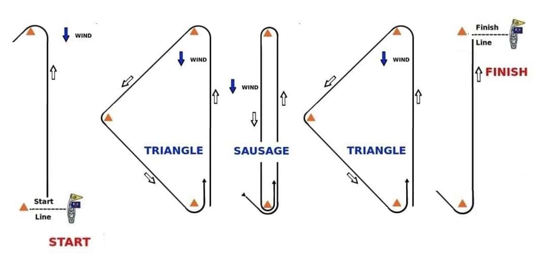 From 2020-2021 season our course will follow an adapted 'triangle sausage triangle' configuration, where the start is off the lee mark and the finish off the windward mark (diagram below), aligned so the initial leg is upwind (image adapted from Jervis Bay Sailing Club). We may go port or starboard as indicated by green (leave marks to starboard) or red (leave marks to port) flags on the start boat, depending on conditions. The course configuration may be changed on the day and announced at the pre-race briefing.