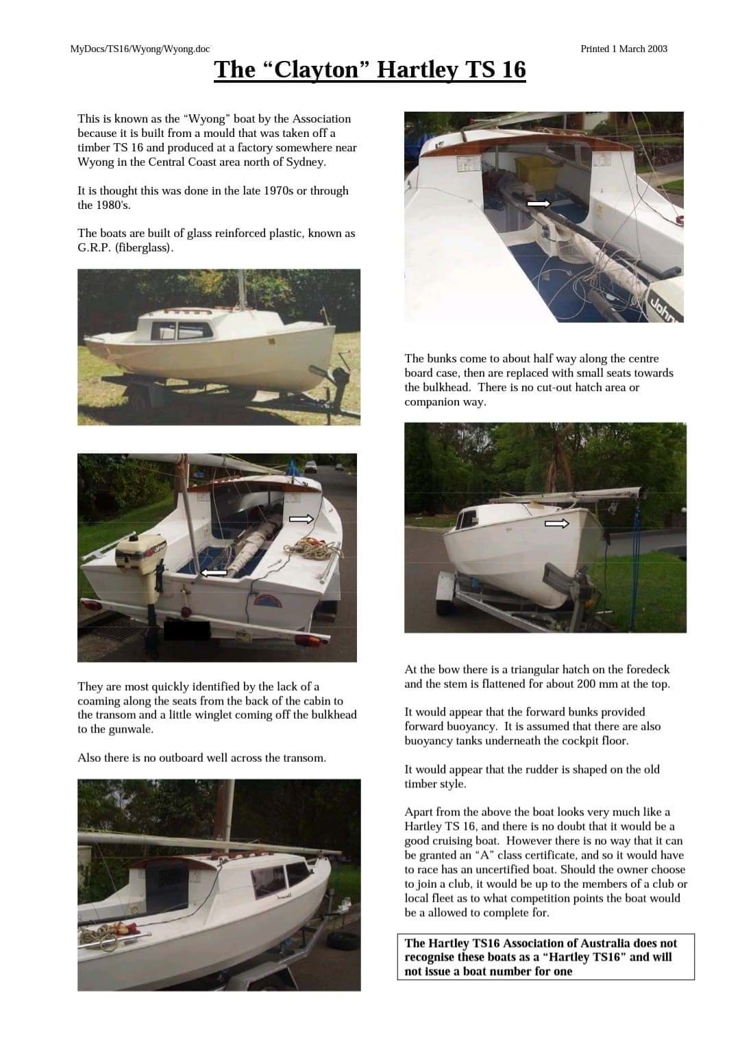 The Hartley TS16s have proved to be an enduring class with plans still being bought today. The only major changes to the original design have been replace and strengthen the wooden spars and rudder with aluminium. The jib halyard tension has also been increased to improve the upwind performance.